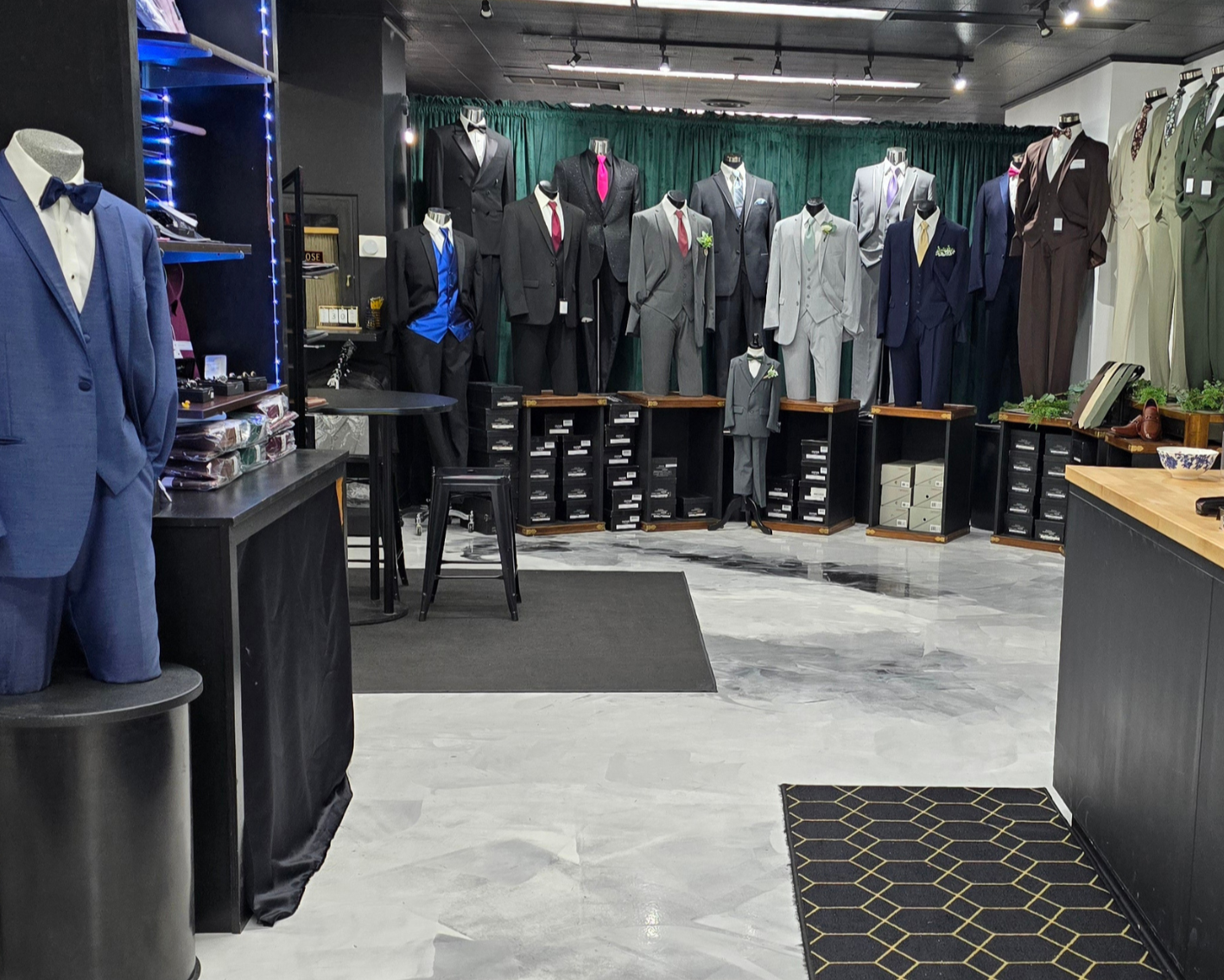 The menswear side expands into the neighboring unit as wedding and formal event rentals flourish.