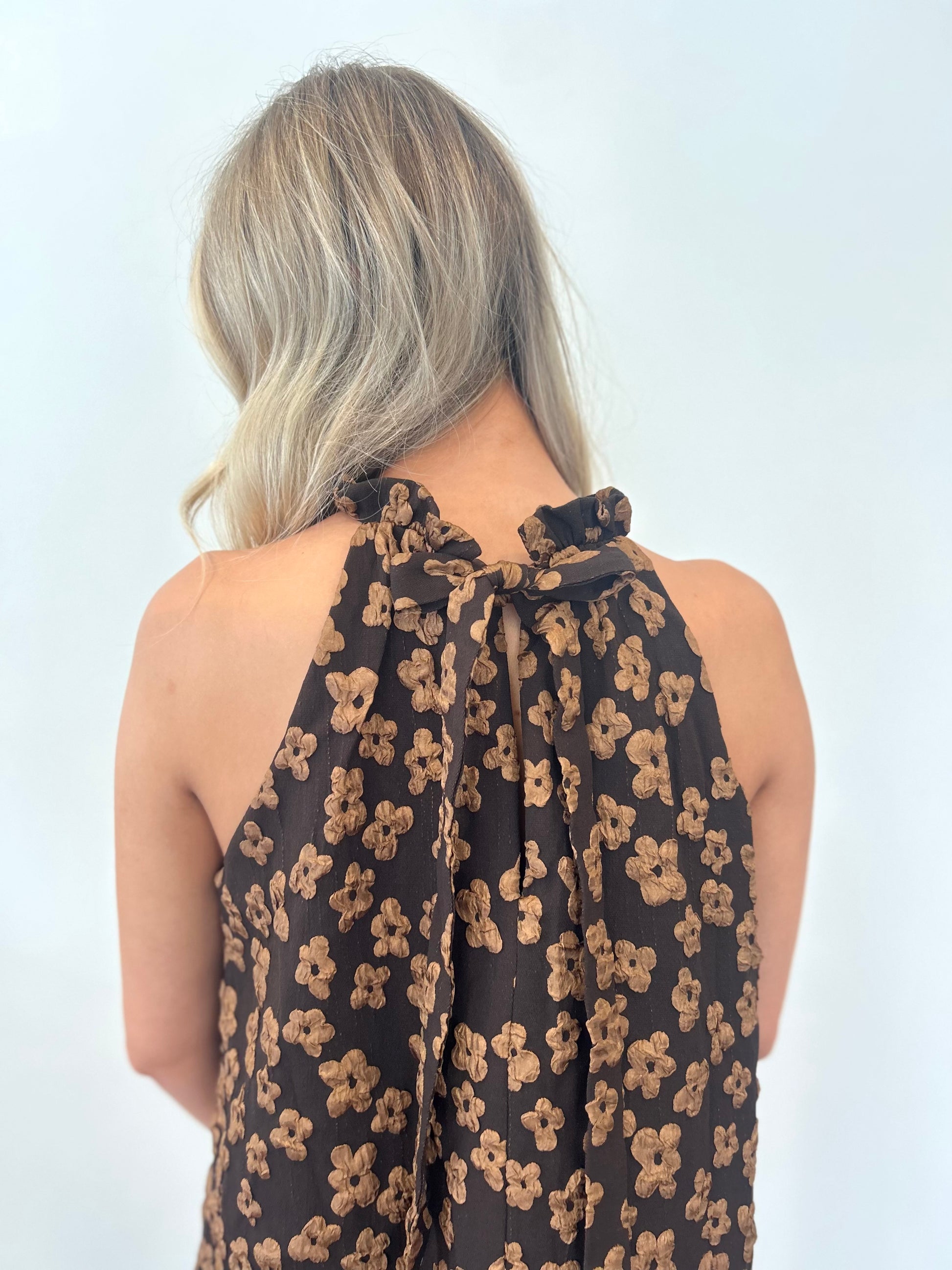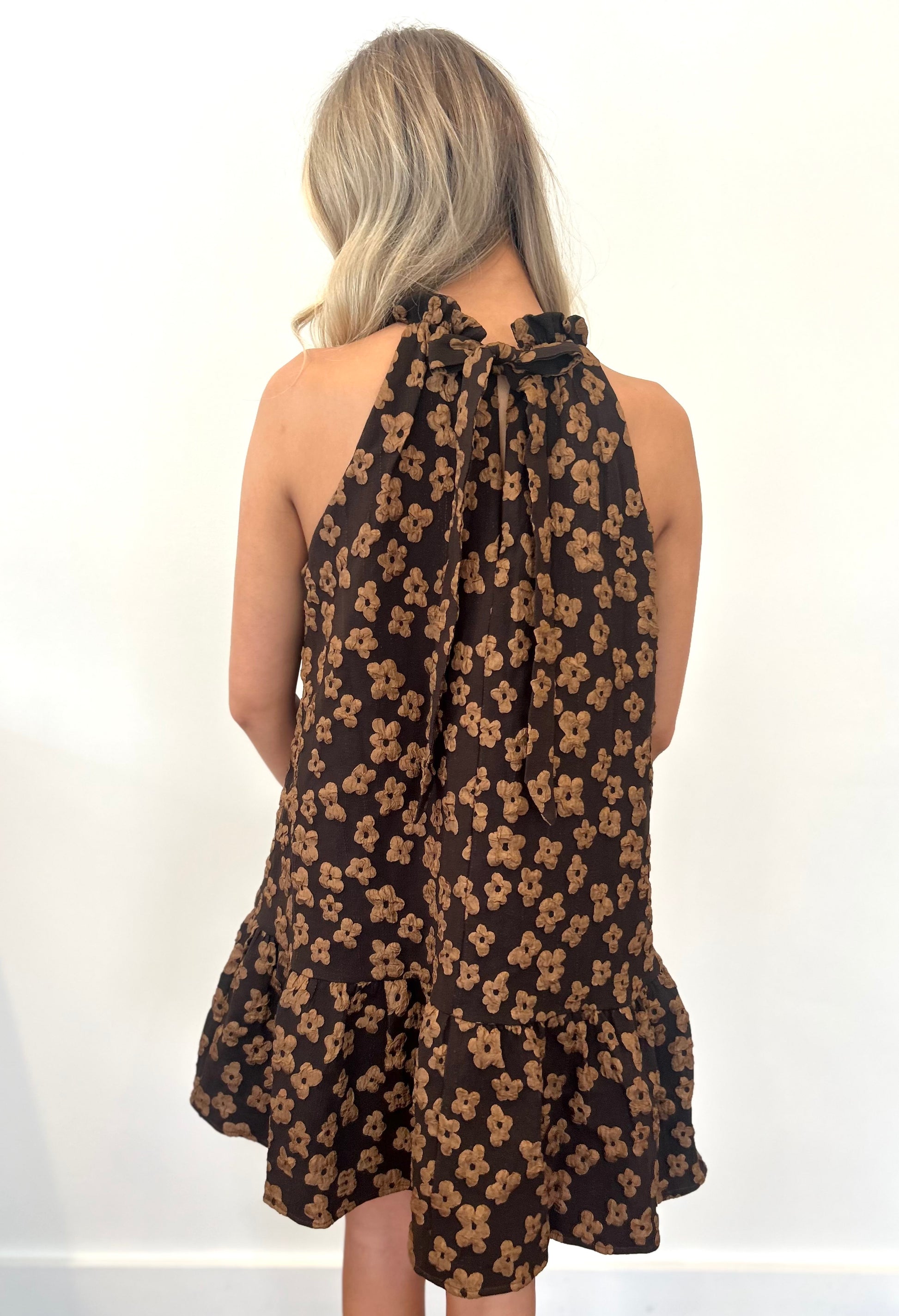 Step into sunshine with this playful brown mini dress adorned with delicate floral prints and a charming high neck. Perfect for twirling through warm days or entertaining friends, its flirty cut and whimsical details bring effortless fun to any outfit.