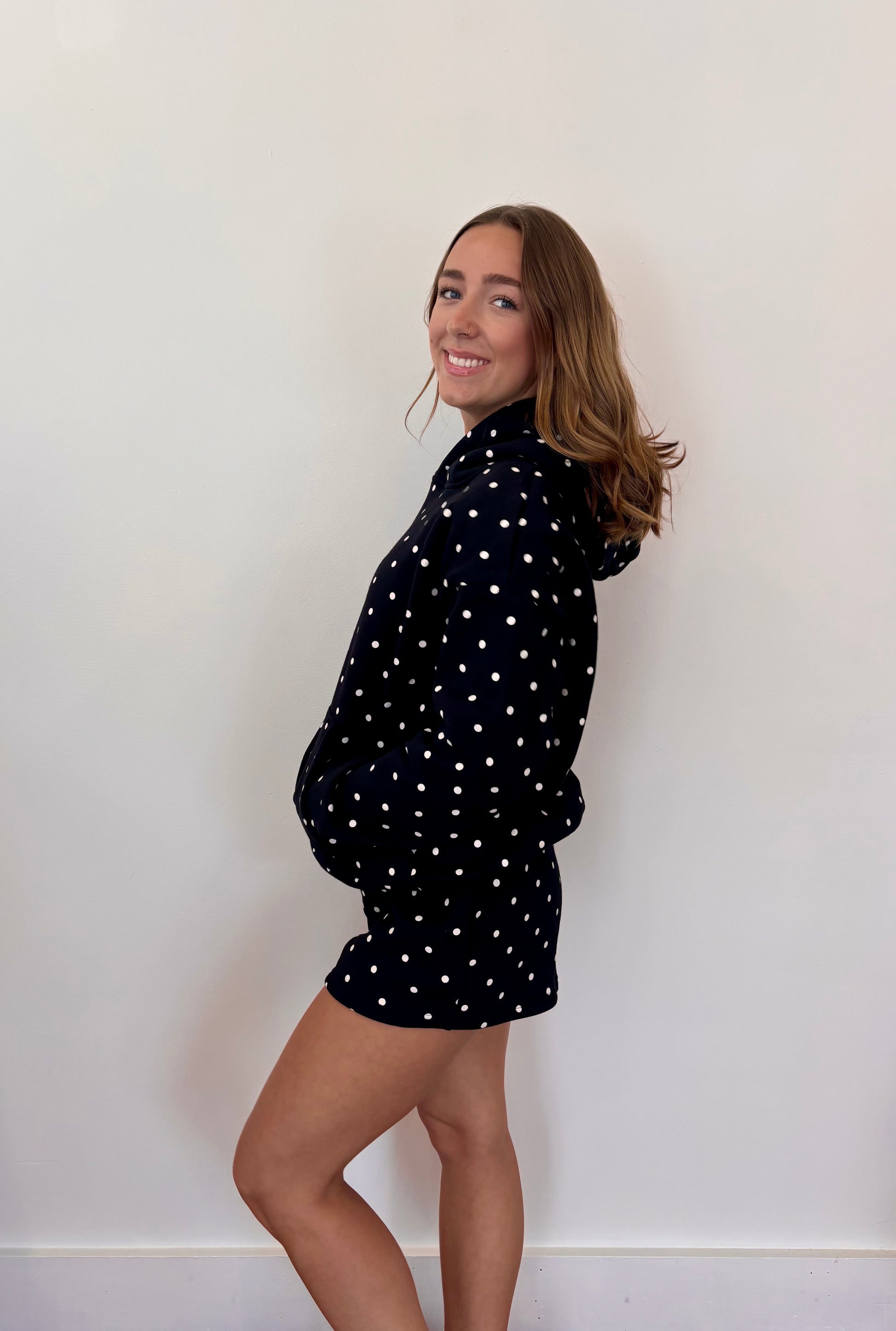 Stay cozy and stylish in this playful Polka-Dot Sweat Set, featuring a black hoodie and matching shorts adorned with cheerful white polka dots. Perfect for lounging or casual outings, this set combines comfort with fun flair, making every relaxed moment feel joyful and bright.