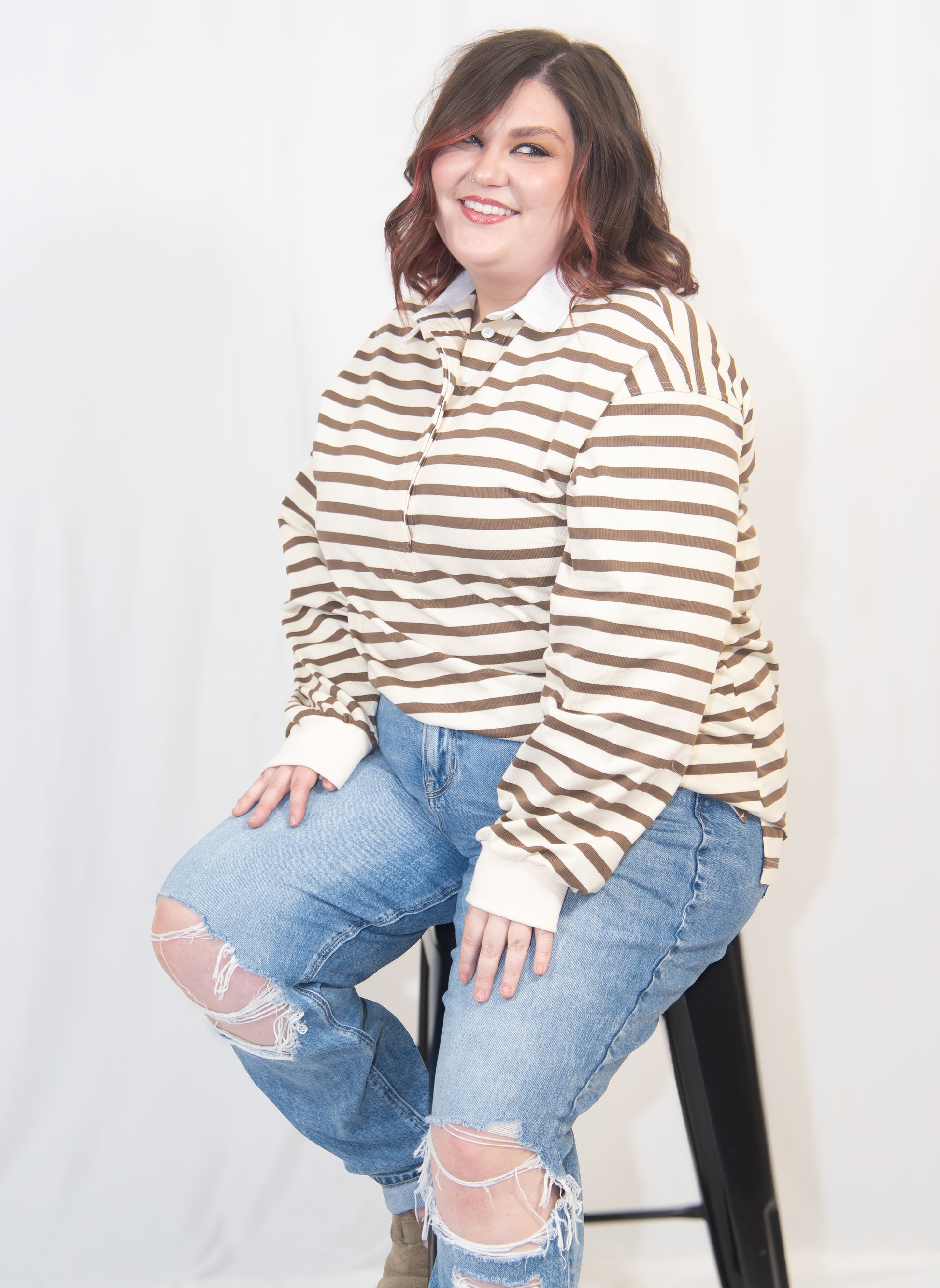 Bring a touch of fun to your wardrobe with this playful collared long sleeve shirt. Its beige base pairs perfectly with bold brown stripes, creating a lively look that stands out. Whether you’re dressing up or down, this shirt adds a quirky twist to your style while keeping things comfortably classic.